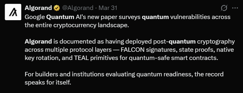 O Algorand fez mais do que a maioria das blockchains para enfrentar ameaças quânticas. A equipe adicionou assinaturas FALCON, um esquema de rede pós-quântico selecionado pelo NIST, para assinar criptograficamente todo o histórico da cadeia a cada 256 rodadas. Isso acontece aproximadamente a cada 12 minutos. Isso protege transações passadas contra futuros ataques quânticos. Se um computador quântico aparecer daqui a anos, os dados históricos do Algorand permanecerão seguros.